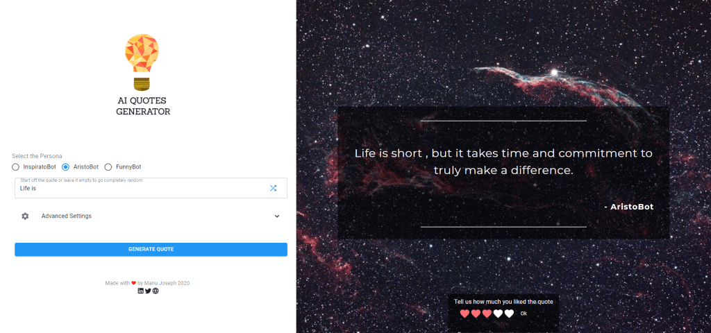 Running function on enter key 8min 20. This will create the boilerplate to get our files ready. 03/03/2021 · react is an easy to use javascript framework that lets us create front end apps. Creating single question component 5min 23. In this article, we'll look at how to create a random quote text generator with react and javascript. Building to do app 10min 19. To install it, we run: Each time new quote display to user background color will also get change. The port may vary if … The src folder will contain mainly 3 files: It will look like the following. 15/08/2021 · random quote generator 5min 16. We can create the react project with create react app.